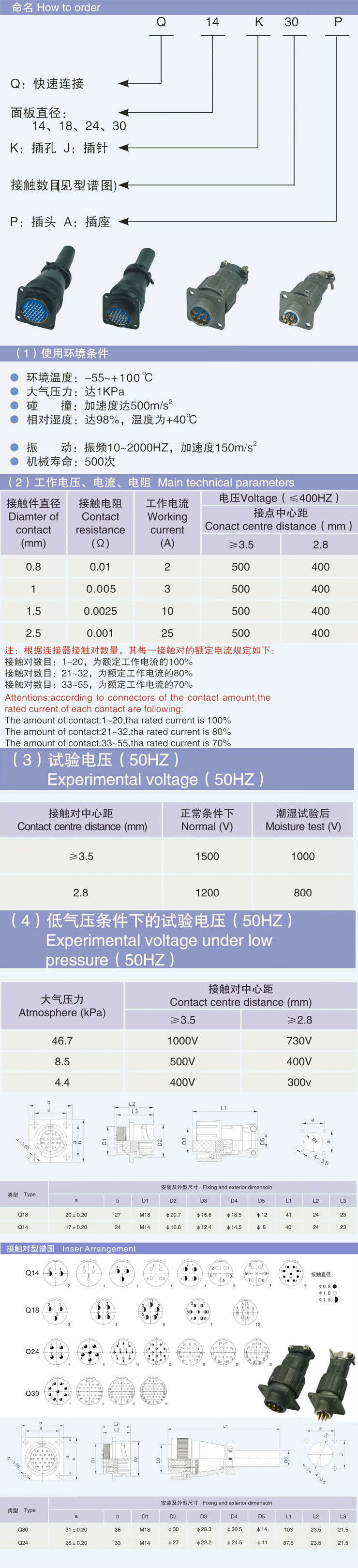 Q serles of circular electrical connector,which owns the small volume and light weight.The bayonet would be coupled quickly.The pins and tha doenleads of jack are adopted welding style.The operation is simple and convenient.The advanced structure and the excellente electrical connectlon capability of the commodlty,with the low price,which is reasonab{e.lt was widely used in series of electronic apparatus a electronic equipment.All the artlcies are manufactured according to the electronic industry stangard called SJ10497 All the pins and jacks would be exchanged as your requirement.