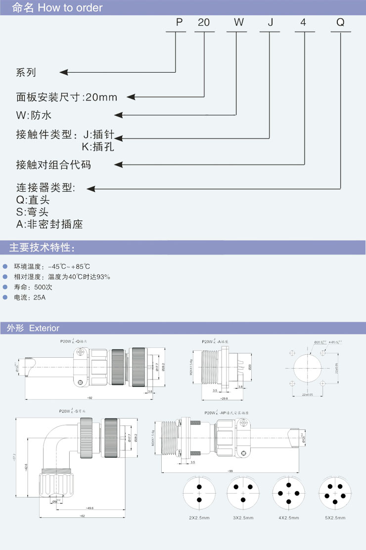 P20W waterproof connector panel mounting size is 20mm,2,3,4,5 Pins,are available,working current 25A,solder terrnination,which can be used underwater when flxed approprlate cable,protection degree lP67.