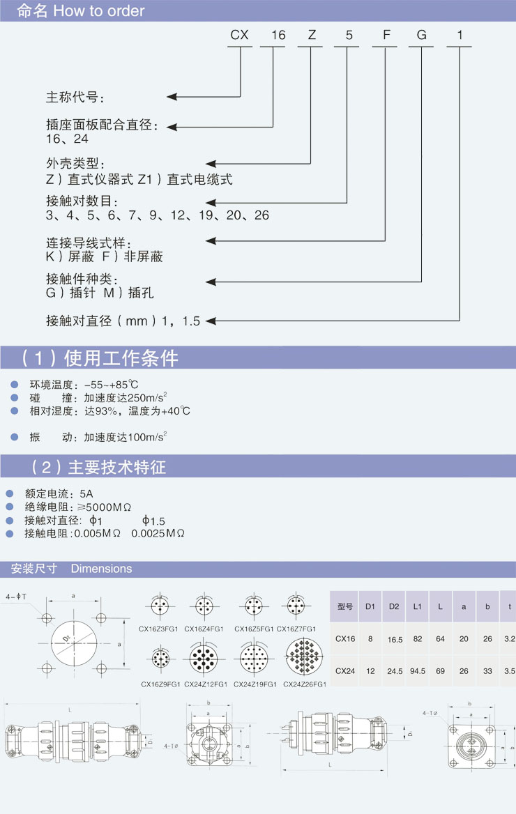 CX series of connector has two speciflcatlons of diamter 16,24(mm)3、4、5、6、7、9、12、19、20、26 pins are cwailable it could be used for the power connection of instruments,electrics and wireless equipments cables or crossing wall clapboard.