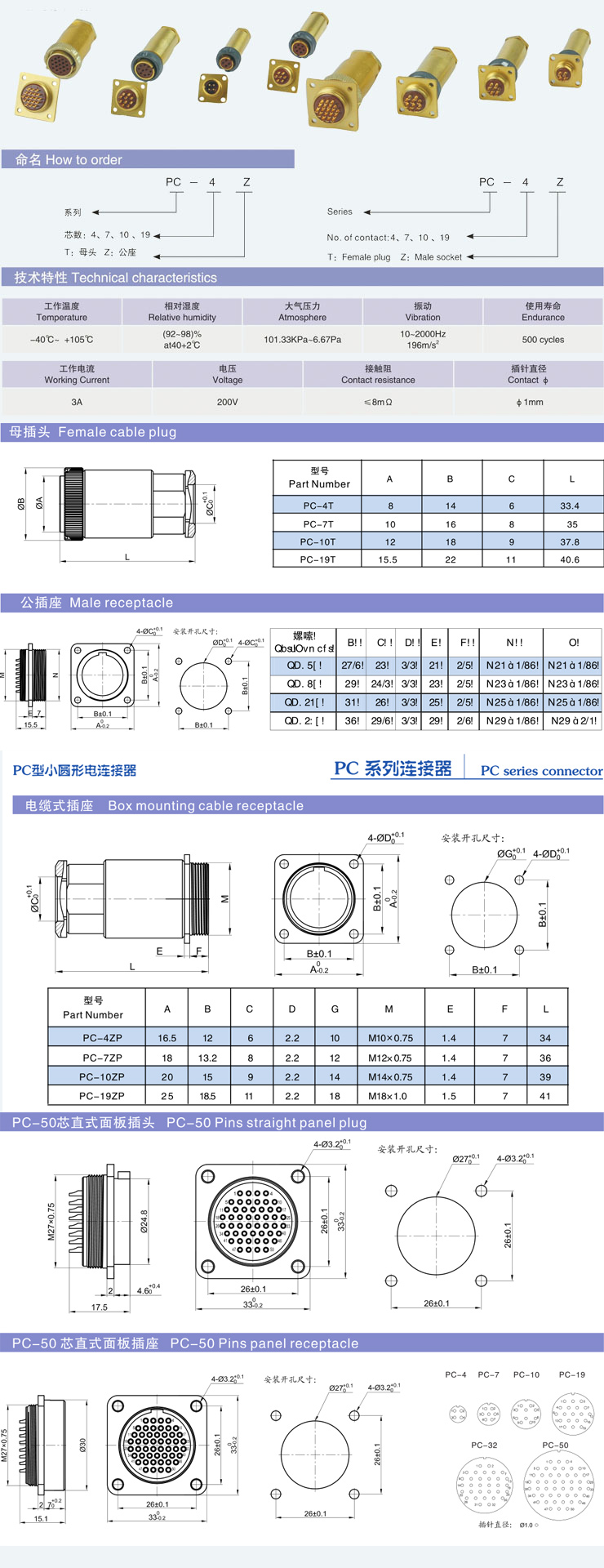PC型小圓形電連接器體積小,金屬鋁合金外殼,重量輕,螺紋連接,電連接可靠,使用方便,目前有4、7、10、19芯,通用俄羅斯的PC產品及國內同類仿制產品,其中4、7芯與Y4M-4,7芯的安裝尺寸相同,是Y4M的良好替代品,廣泛應用于各種電子儀器,電子設備間的電連接。安裝方式有法蘭盤式和電纜式兩種。