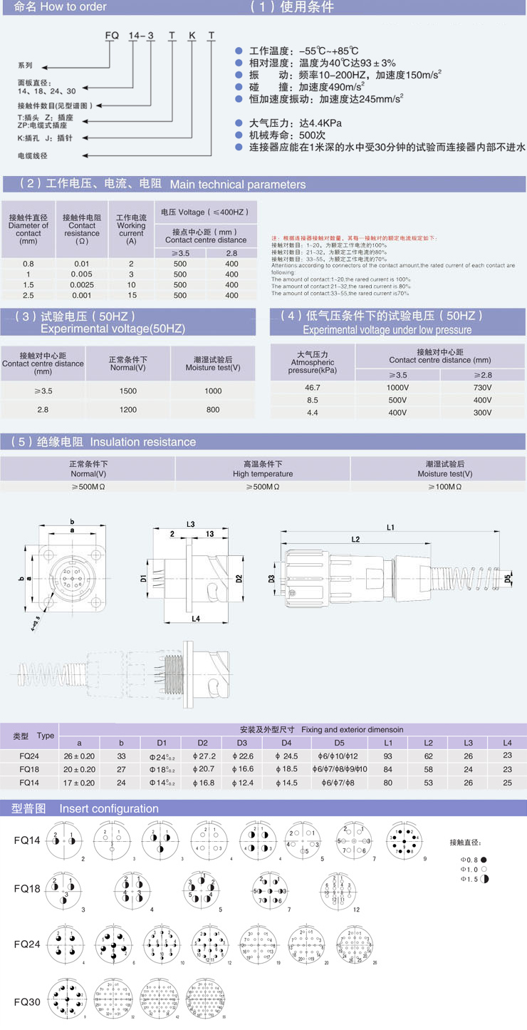 FQ series waterproof circular connectors accord with the standard DZ4Q/RE008-84,whlch is certificated by Ministry of the electronics industry-adminlstratlve bureau office.The Product owns advancedstructure,hlgh dependability small volume,light weight,excellent waterproof,and the bayonets are connected qulckly.The pins and the down-lead of jacks are made by welding.Asthese characte ristlcs,it’s easy to operare and it make a low price whlch is more-reasonable.it was widely used in electric connection among various kinds of electric equipments.